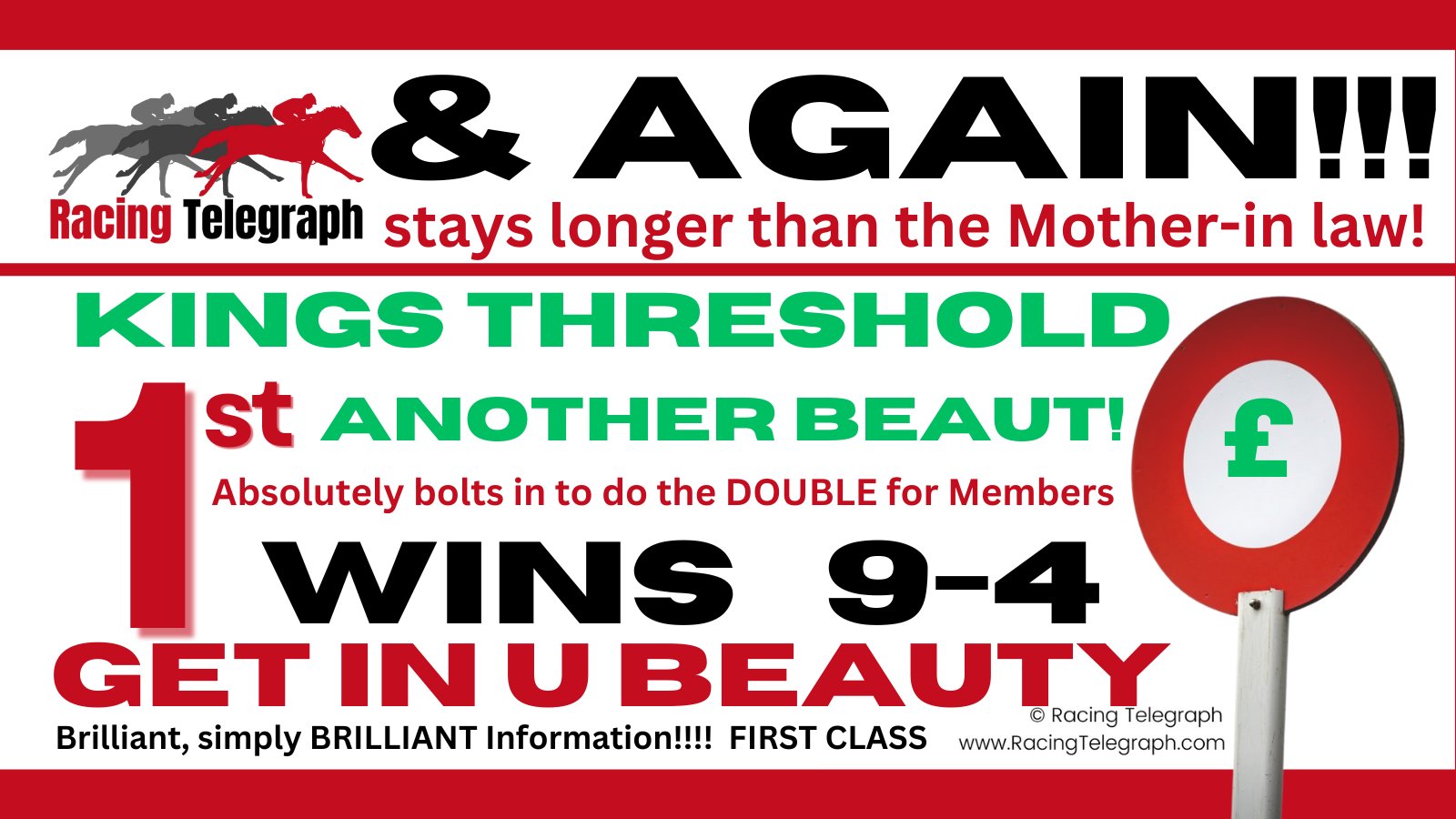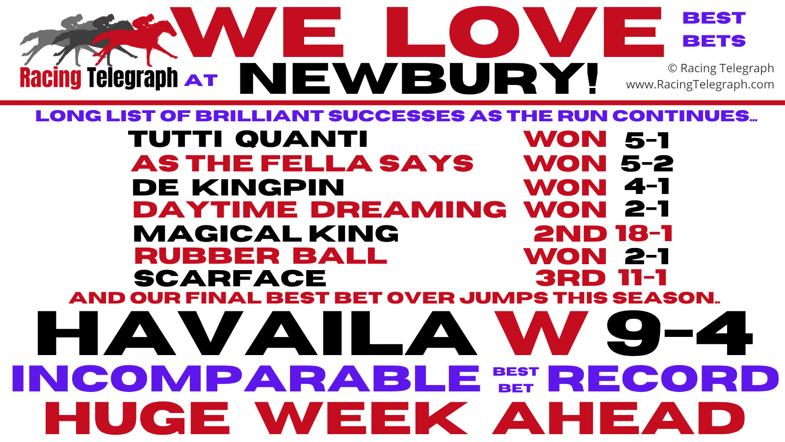 See our history and track record for proof of our credentials. We will illustrate that Racing Telegraph is all the help you need in the perennial battle against the bookmaker. Providing our BEST BETS only, fully staked. Follow us on social media or visit our Latest News.