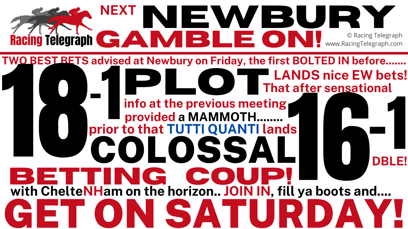 Welcome to the Racing Telegraph. Based at the heart of Newmarket, the headquarters of British horseracing since 1989 and, with a huge nationwide network of racing professionals to assist, we aim to help you make your betting pay.